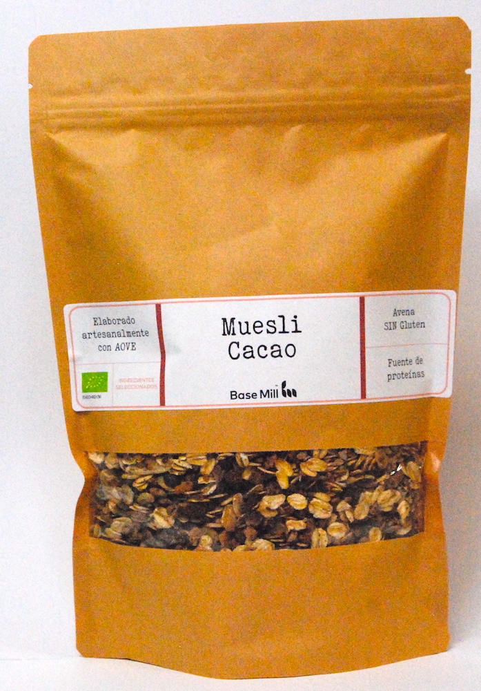 Muesli Cacao elaborado con copos de avena sin gluten, además de Okara de almendra y dátil, almendras peladas, pepitas de cacao (cacao 70%, manteca de cacao, azúcar, extracto de vainilla), dátil, cacao desgrasado en polvo, AOVE